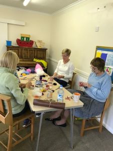 | Members making cards | A member making coasters | Members knitting keyrings |